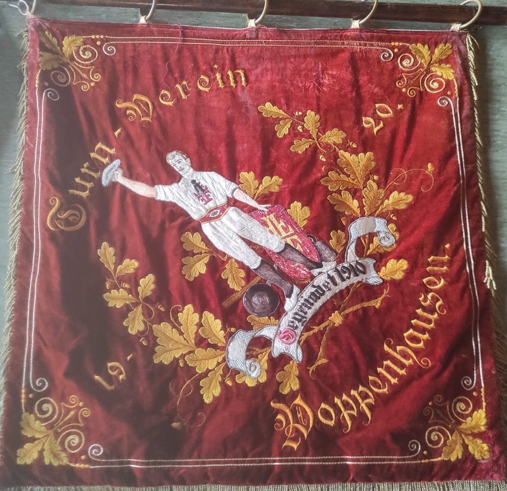Die Vereinsfahne des TSV Poppenhausen 1910 e.V. ist über 100 Jahre alt und ein bedeutendes Symbol unserer Vereinsgeschichte, unserer Werte und unseres Zusammenhalts. Leider ist sie inzwischen stark beschädigt: Sie weist Risse auf und färbt ab, sodass sie bei öffentlichen Anlässen kaum noch eingesetzt werden kann.